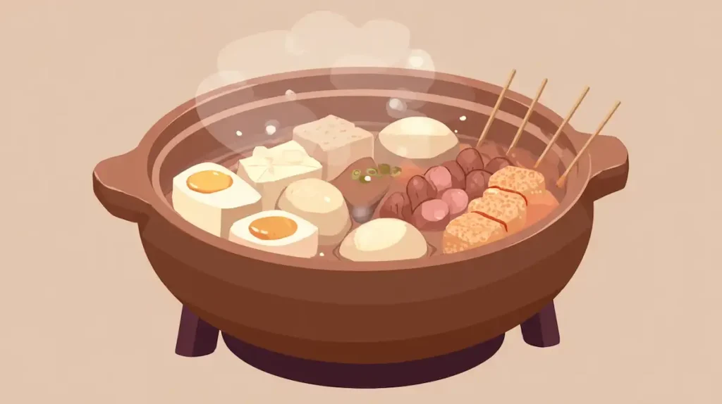 Daikon radish is the star, along with boiled eggs, konnyaku, tofu, and fishcakes. Some people love beef tendon, mochi pouches, or even cabbage rolls.