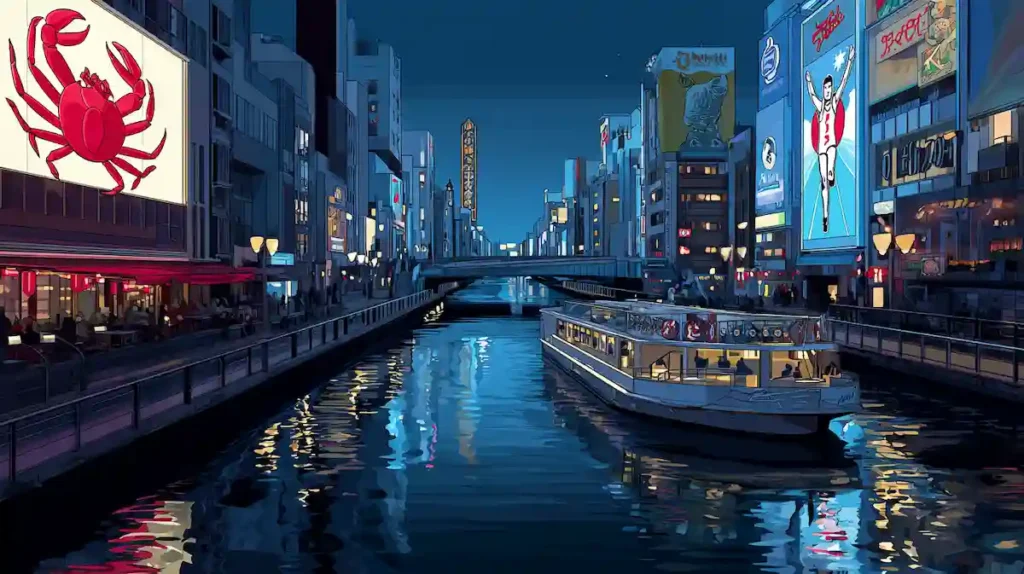 It is famous for the Glico running man sign, the giant moving crab from Kani Doraku, and its colorful night views along the river.