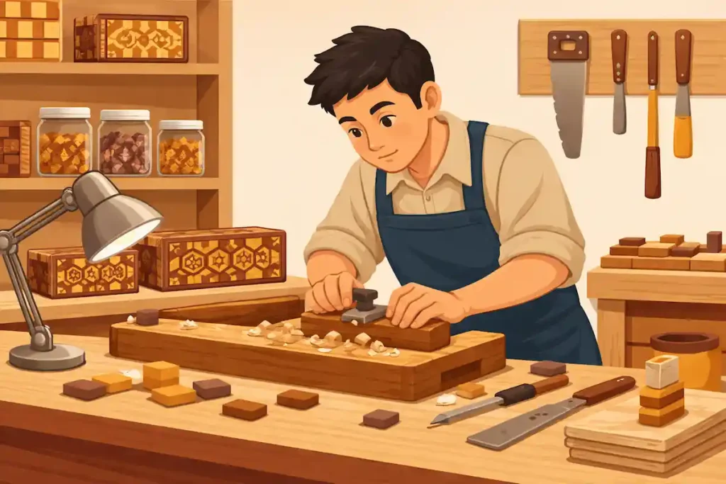 色や木目の異なる天然木を組み合わせて模様を作る伝統的な木工工芸