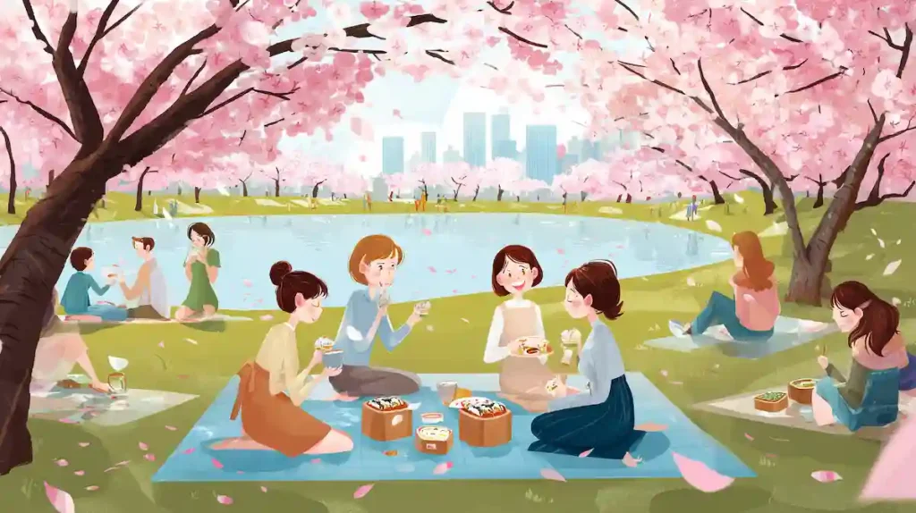 - 花見は桜の木の下で飲食を楽しむ伝統行事で、家族や友人、会社の同僚と集まる